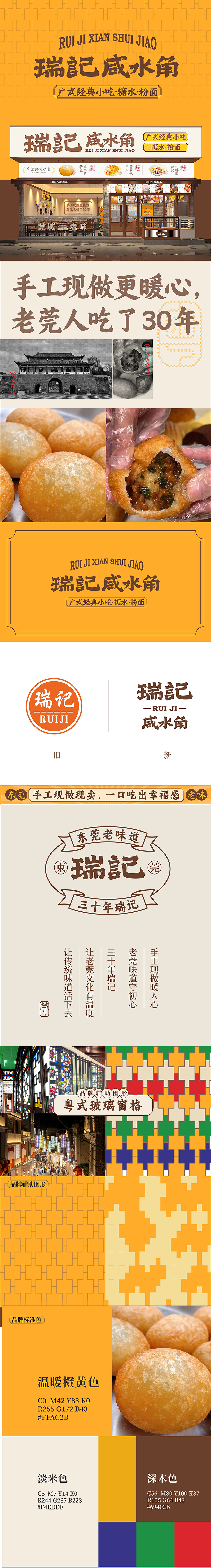 “瑞记咸水角”作为深耕东莞30年的广式小吃品牌,以手工现做的咸水角、经典包点及糖水为核心产品,承载着老莞人的味觉记忆。为应对新消费趋势,餐赢计团队通过品牌战略定位、视觉形象(VI)、空间体验等系统性升级,以“经典年轻化”为核心策略,强化文化认同感,拓展客群边界,将“瑞记”从区域小吃店升级为“广式经典生活方式符号”,实现传统品牌的现代化破局。