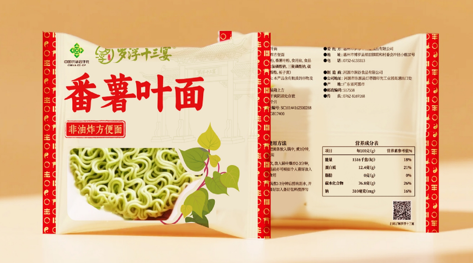 核心视觉符号:大面积菜心插画(绿色)与红色背景形成强烈对比,直观传递“蔬菜面”的产品特性,降低消费者认知成本;罗浮山门楼剪影强化地域文化符号,与“罗浮十三宴”品牌名形成呼应,增强文化信任感。